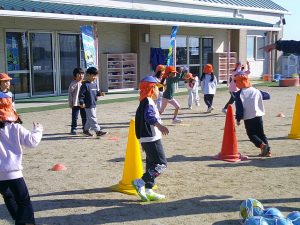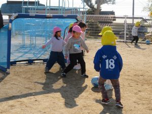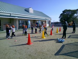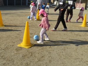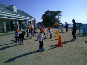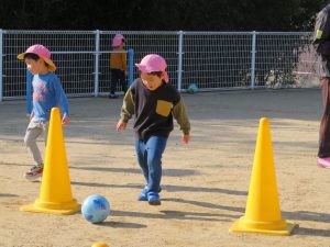 今回は2回目ということもあり、コーンの間をドリブルしたり、ボールを足で止めたり…「手を使っちゃいけない!」というルールを思い出していた子もいました😊
