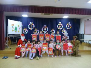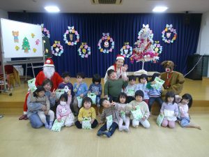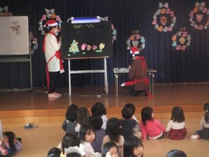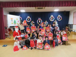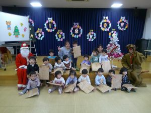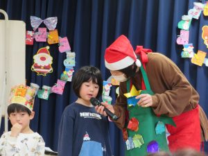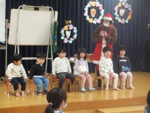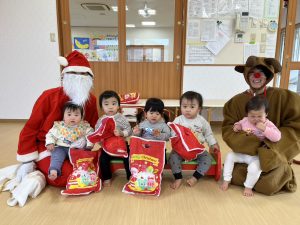 誕生会の後はクリスマス会🎄みんなで「モミの木じいさん」のお話をみていると、サンタクロースとトナカイがプレゼントを持って来てくれて大喜びの子どもたちでした😊