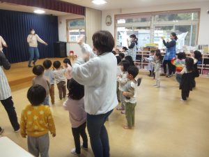 子どもたちは「お」がつくもの何かな?と考えたり、文字をならびかえたらどんな言葉になる?と友達や保育者と話したりしながら楽しそうにみていましたよ🎵その後はみんなでカリスマックスの曲に合わせてストレッチをしたりもして元気に体を動かしました🎵